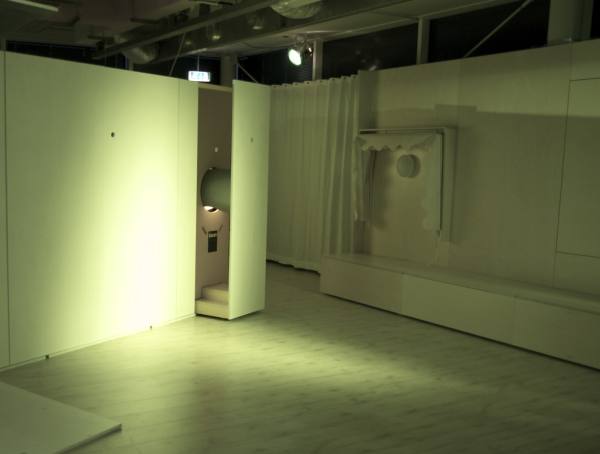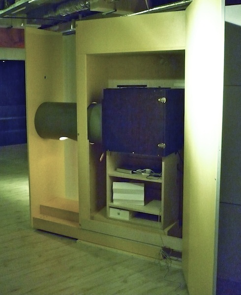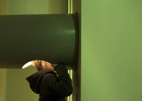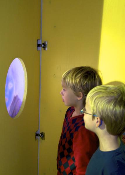 ... an artwork I made several years ago. See this link to the original Blikkensteler. The translation of "Blikken stelen"? is something like "stealing one's glances". It was originally ment for adults, but this version is adapted to kids from 4 to 7 years. Integrated are a camera and software for face-detection. (MaxMSP)